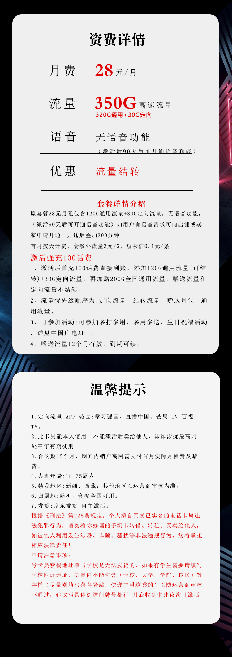 温馨提示:全国通用!点击下方按钮办理广电飞启卡【28元350G】,具体权益请查看详情图~
