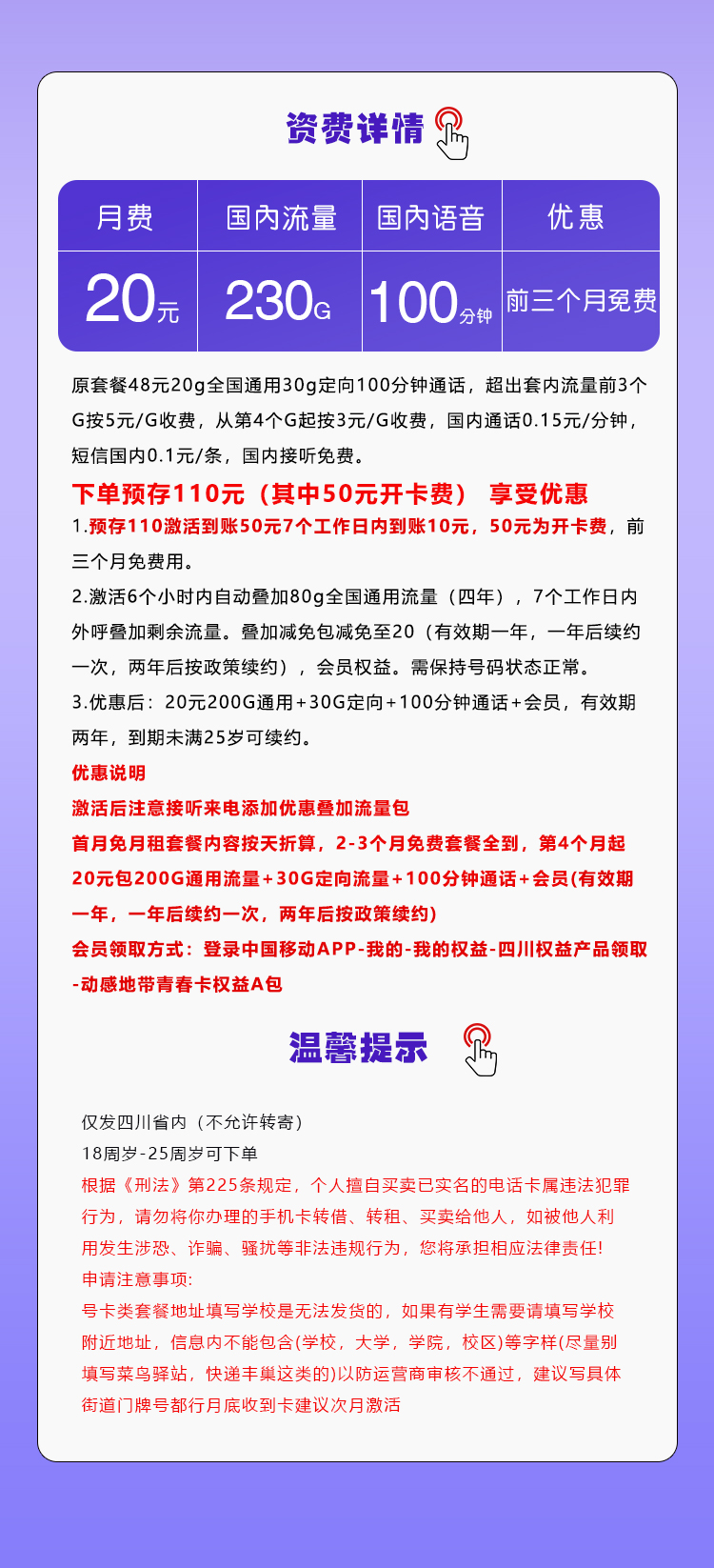 四川移动专享卡【20元230G+100分钟+会员】办理指南