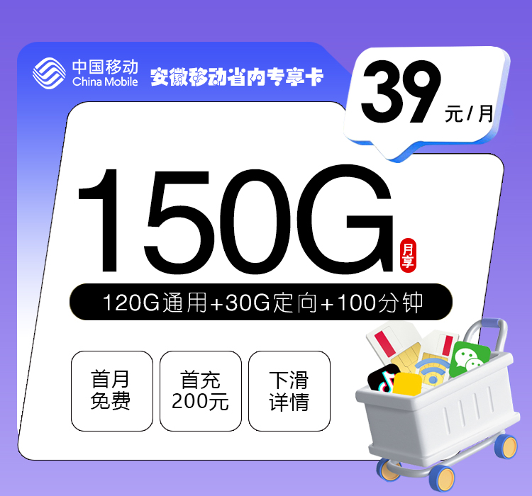 - 产品名称:安徽移动省内专享卡【39元150G+100分钟】