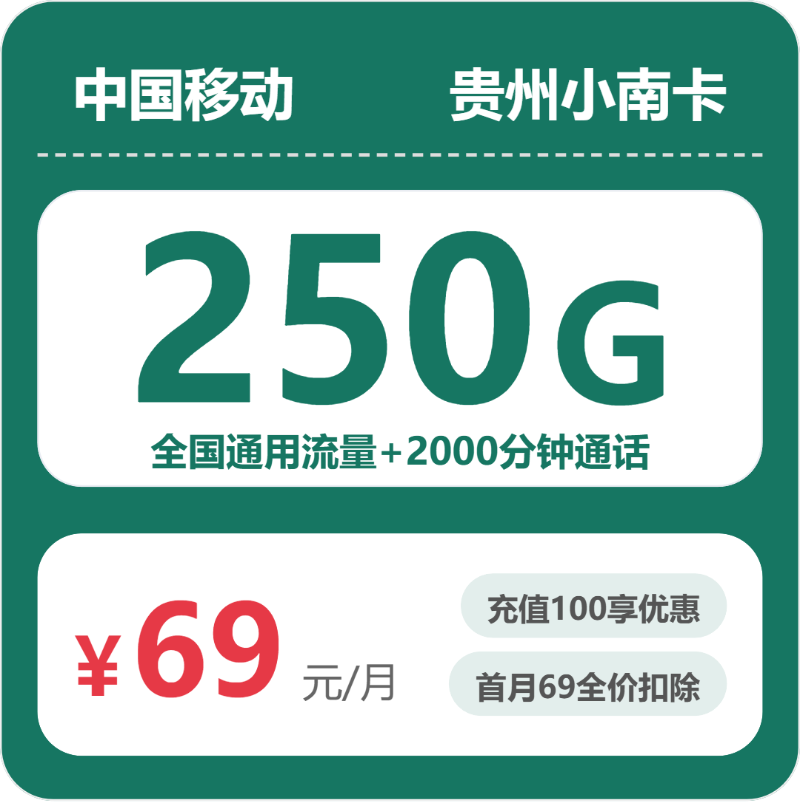 移动小南卡69元包250G通用+2000分钟