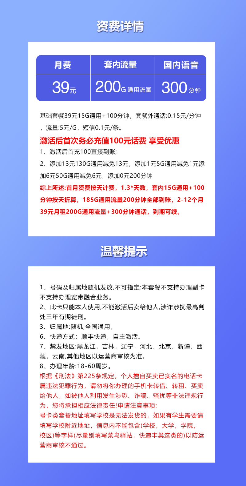 温馨提示:全国通用!点击下方按钮办理联通飞倾卡【39元200G+300分钟】,具体权益请查看详情图~