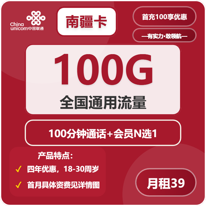 联通南疆卡39元包100G通用+100分钟