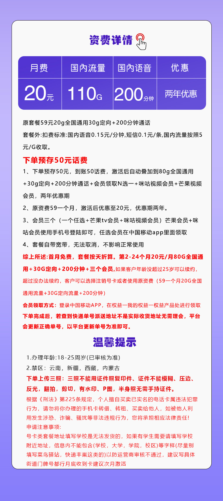 温馨提示:全国通用!点击下方按钮办理移动飞邱卡【20元110G+200分钟+三个会员】,具体权益请查看详情图~
